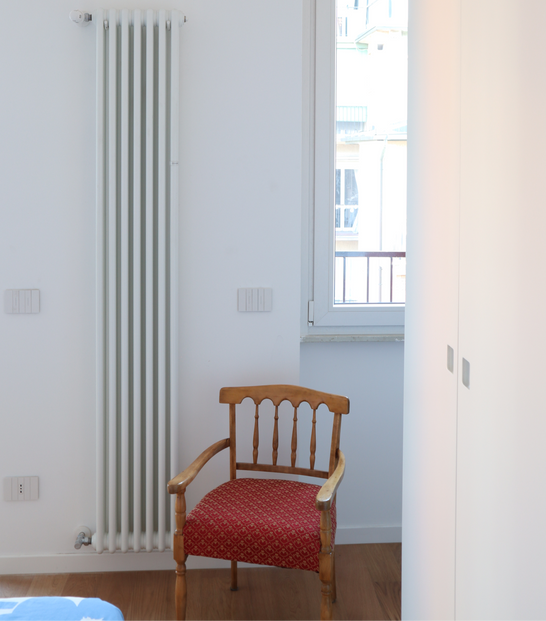 In the second bedroom, the new bathroom is unexpectedly housed inside an oak volume which, completed by a storage area and a space for rest, creates a real micro-architecture that solves the functional request with a playful gesture.
